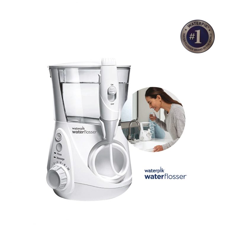 O fio dental aquático Waterpik Aquarius remove até 99,9 por cento da placa bacteriana e é até 50 por cento mais eficaz do que o fio dental para melhorar a saúde das gengivas. Basta encher o reservatório com água morna, colocar a ponta na boca e começar a usar fio dental.